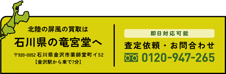 当店スタッフが安全な運搬ルートを確認後、慎重に運び出しいたします。お買取対象の屏風だった場合、その場で現金でお買い取りいたします。ご不明点ございましたら、お電話、お問い合わせフォームからお問い合わせください。